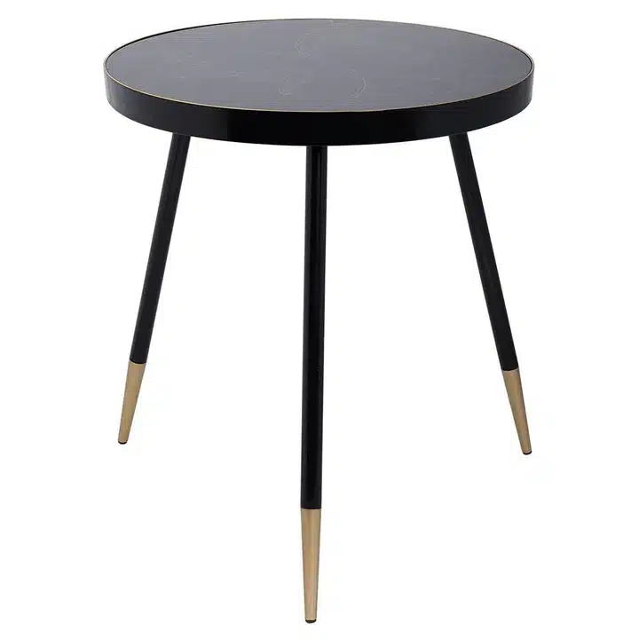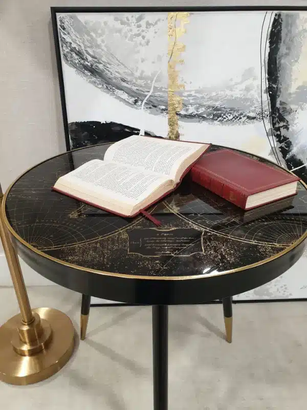 Black painted surround and leg with gold tip, 60cm diameter side table with black & antiqued gold world map pattern top with acrylic overlay. Can be styled solo or as part of a collaboration with the Palm, Bellatrix & Vega side tables for the ultimate styling effect.